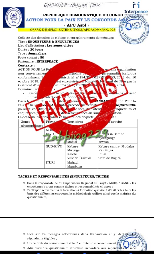 Ce document fait mention d’un prétendu projet ”Muhangano” recrutant des enquêteurs journaliers et d’un bureau de l’APC dans la ville de Goma.